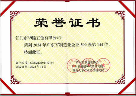 Jiangmen Huajin Metal Products Co., Ltd. and Jiangmen Huamu Hardware Co., Ltd., subsidiaries of Huajin Group, have been listed among the "Top 500 Manufacturing Enterprises in Guangdong Province in 2024" by virtue of their strong strength and outstanding quality.